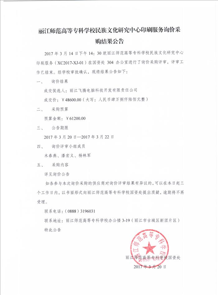 丽江师范高等专科学校民族文化研究中心印刷服务询价采购结果公告
