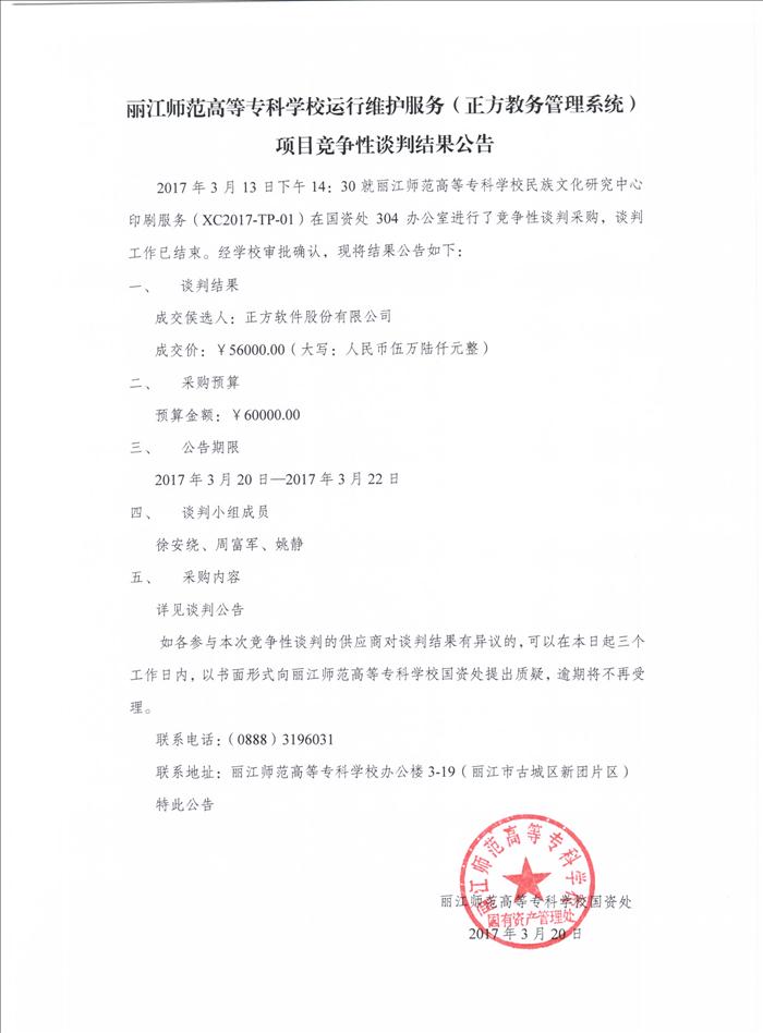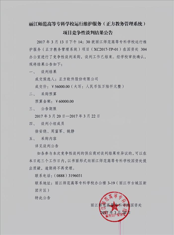 丽江师范高等专科学校运行维护服务(正方教务管理系统)项目竞争性谈判结果公告