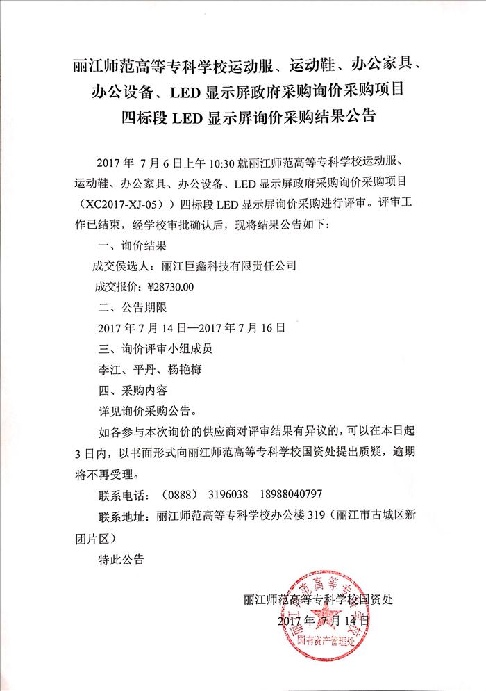 丽江师范高等专科学校运动服、运动鞋、办公家具、办公设备、LED显示屏政府采购询价采购项目二标段办公家具询价采购结果公告