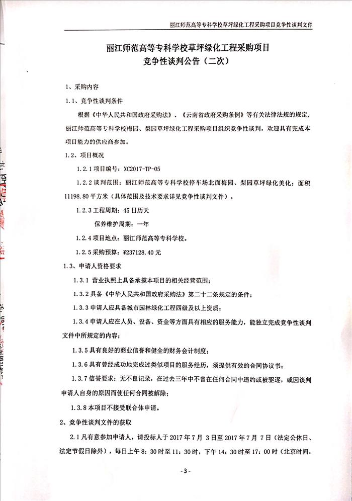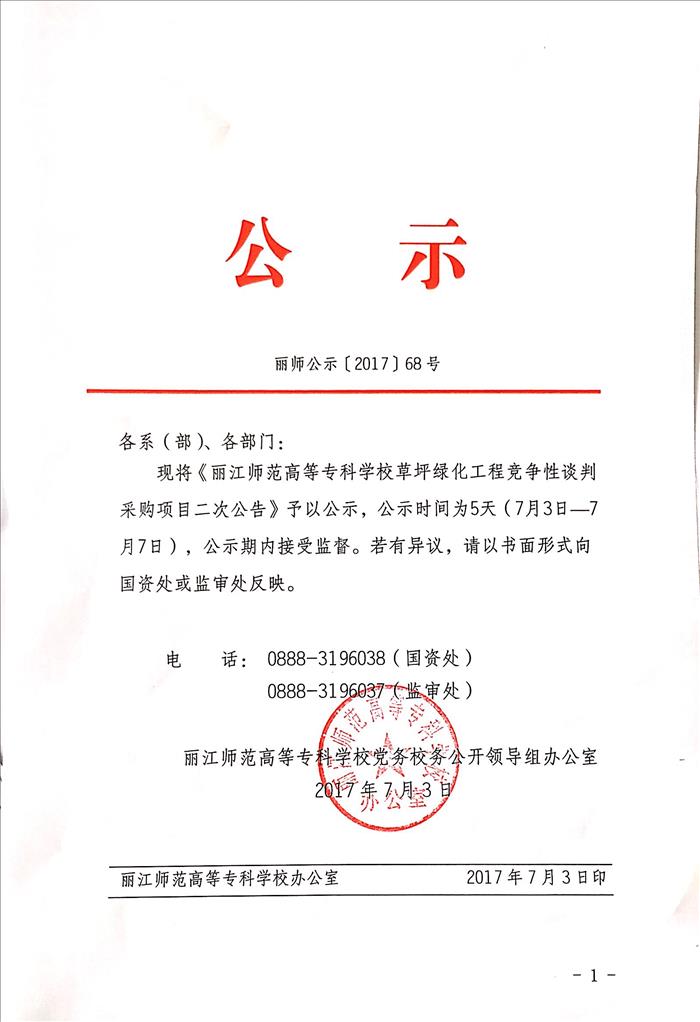 上一条:丽江师范高等专科学校2017-2018学年教材供应商选取项目竞争性谈判结果公告 下一条:丽江师范高等专科学校图书馆主书库一楼地面修缮工程询价采购项目公告(二次)