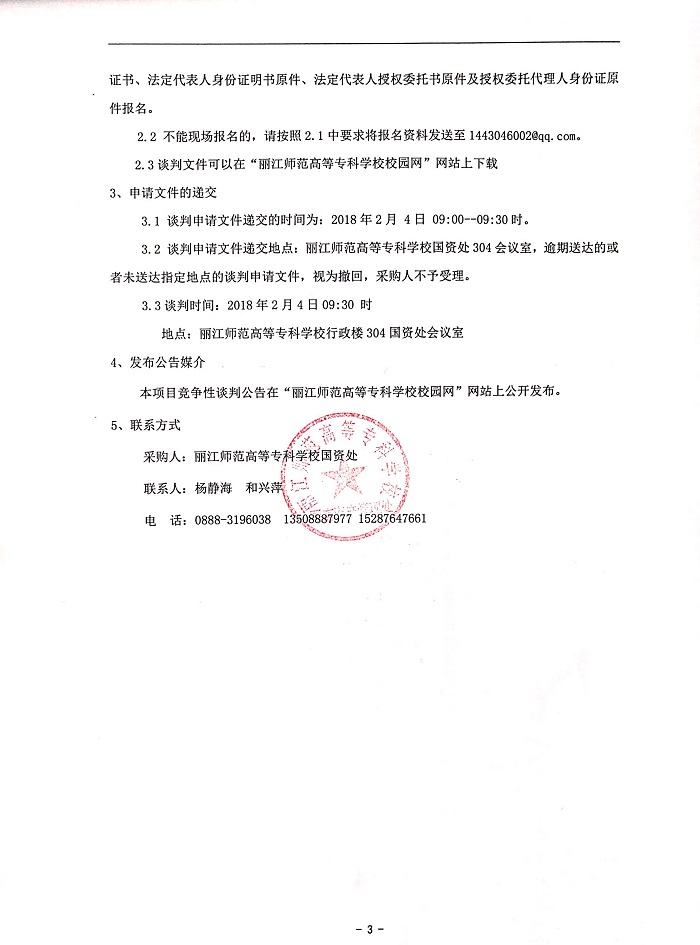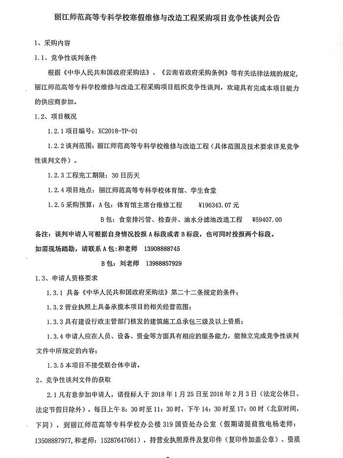 丽江师范高等专科学校寒假维修与改造工程采购项目竞争性谈判公告