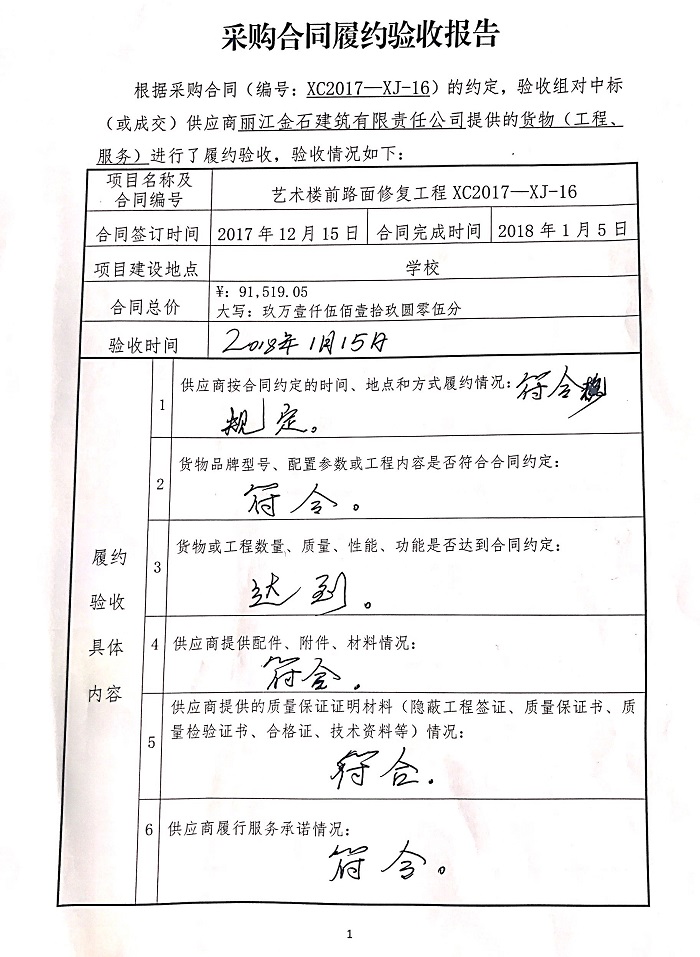丽江师范高等专科学校艺术楼前路面修复工程采购合同履约验收结果公告