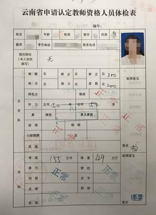 ①《云南省教师资格认定体检表》(附件二)由申请人下载后,粘贴本人一寸照片自行到医院体检。
