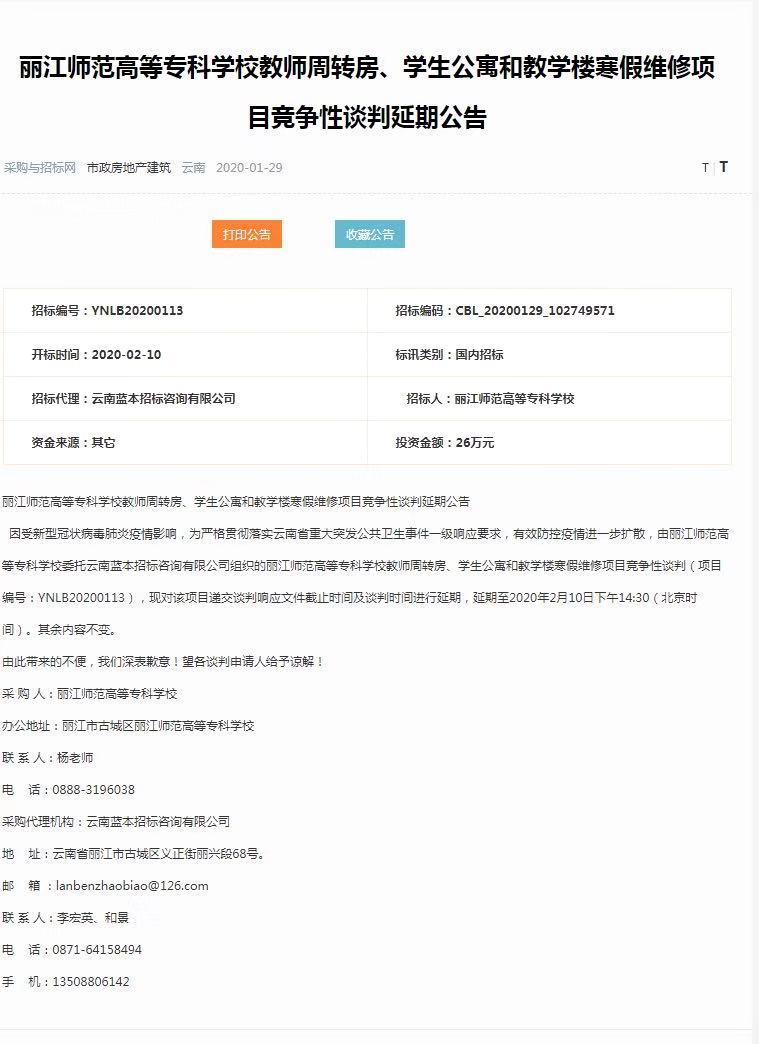 丽江师范高等专科学校教师周转房、学生公寓和教学楼寒假维修项目竞争性谈判延期公告
