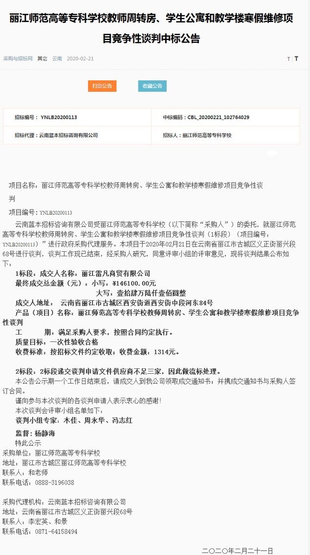 丽江师范高等专科学校教师周转房、学生公寓和教学楼寒假维修项目竞争性谈判中标公告