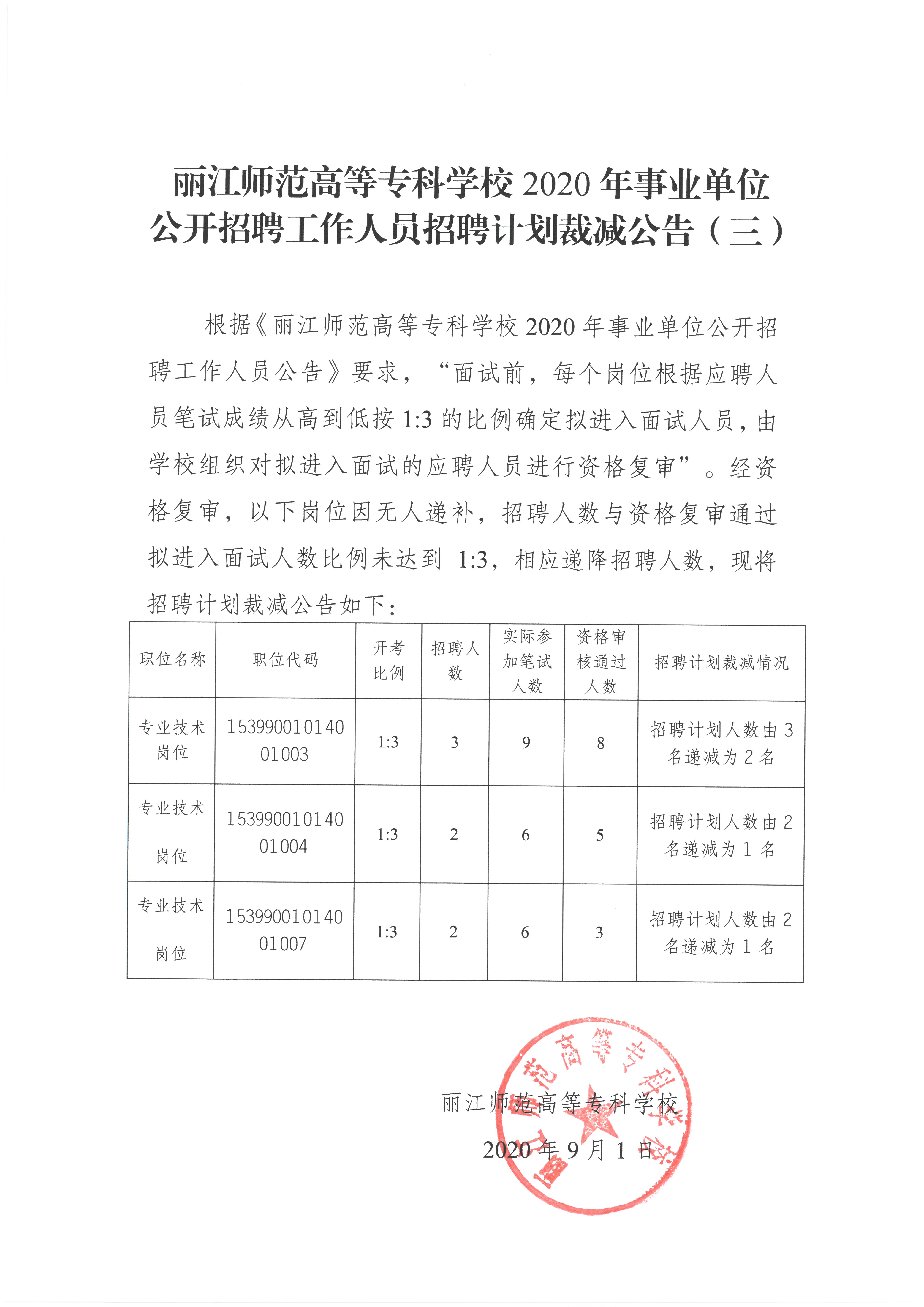 丽江师范高等专科学校2020年事业单位公开招聘工作人员招聘计划裁减公告(三)