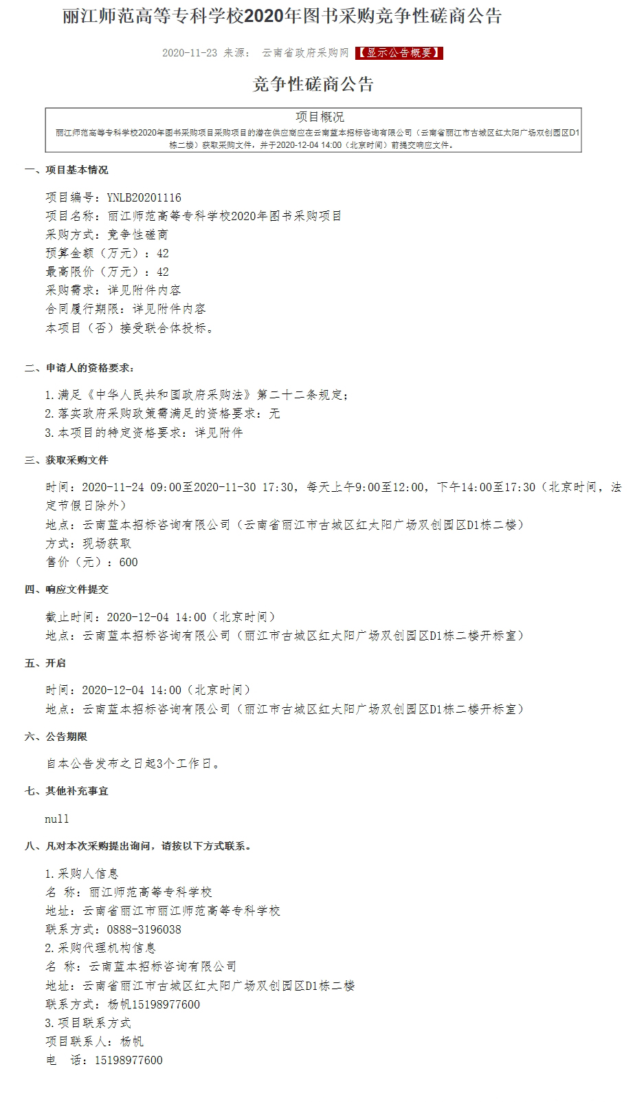 丽江师范高等专科学校2020年图书采购竞争性磋商公告