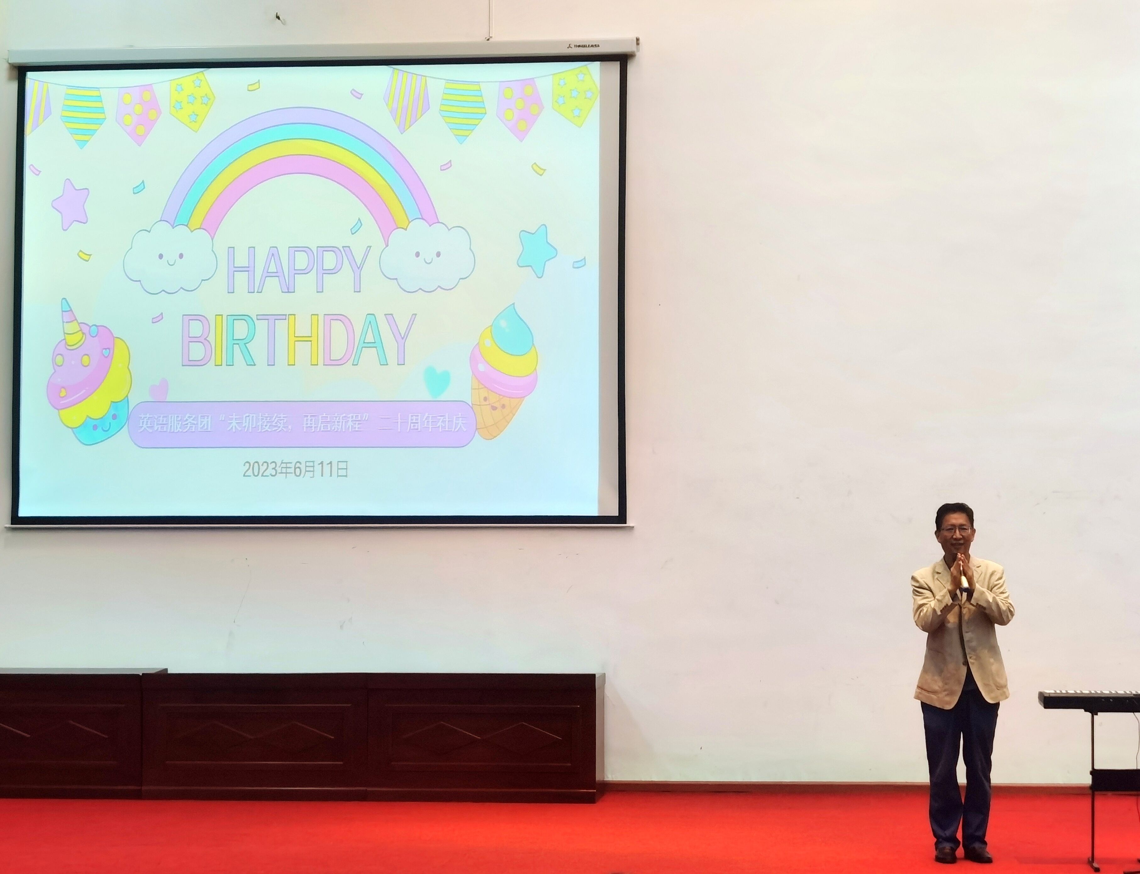 段平华老师为本次活动致辞。他回顾了英语服务团的成立初衷和发展历程,并向筹备和举办本次社庆的同学们表示感谢。他表示,英语服务团作为全校最早成立的社团之一,二十年来为广大英语学习爱好者提供了提升自我、服务他人的平台,有效助力了英语语言环境的创设。他希望英语服务团能以更好的姿态,再现服务团往日辉煌。