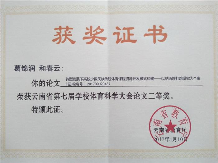 根据《云南省教育厅关于公布第七届学校体育科学大会论文评选结果的通知》(云教体[2017]1号)的情况通报,云南省第七届学校体育科学大会共征集到论文918篇,经组织专家进行“双盲”网上评审、集中会审、学术不端检测,最终评选出一等奖33篇(占4.5%),二等奖55篇(占7.7%),三等奖122篇(占17.2%)。williamhill葛锦润、和春云老师撰写的《转型发展下高校少数民族传统体育课程资源开发模式构建——以纳西族打跳研究为个案》荣获二等奖,这也是williamhill首次在云南省学校体育科学大会论文评选中获奖。