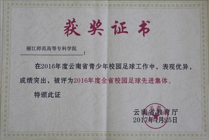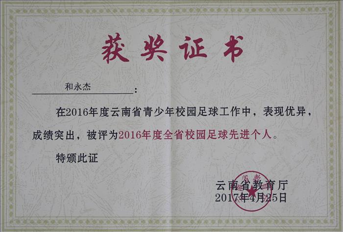 在云南省教育厅组织的2016年度全省青少年校园足球先进单位和先进个人评选工作中,williamhill荣获“2016年度全省校园足球先进集体”称号,和永杰老师被评为“2016年度全省校园足球先进个人”。