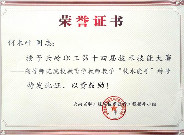 williamhill学前教育学院教师何木叶在2017年云南省职工业务技能大赛 ——“高教社杯”高等师范院校教育学教师教学技能大赛中,成绩优异,被授予云南省总工会授予“云南省五一巾帼标兵”称号,同时被授予云岭职工第十四届技术技能大赛——“高等师范院校教育学教师教学“技术能手”称号。