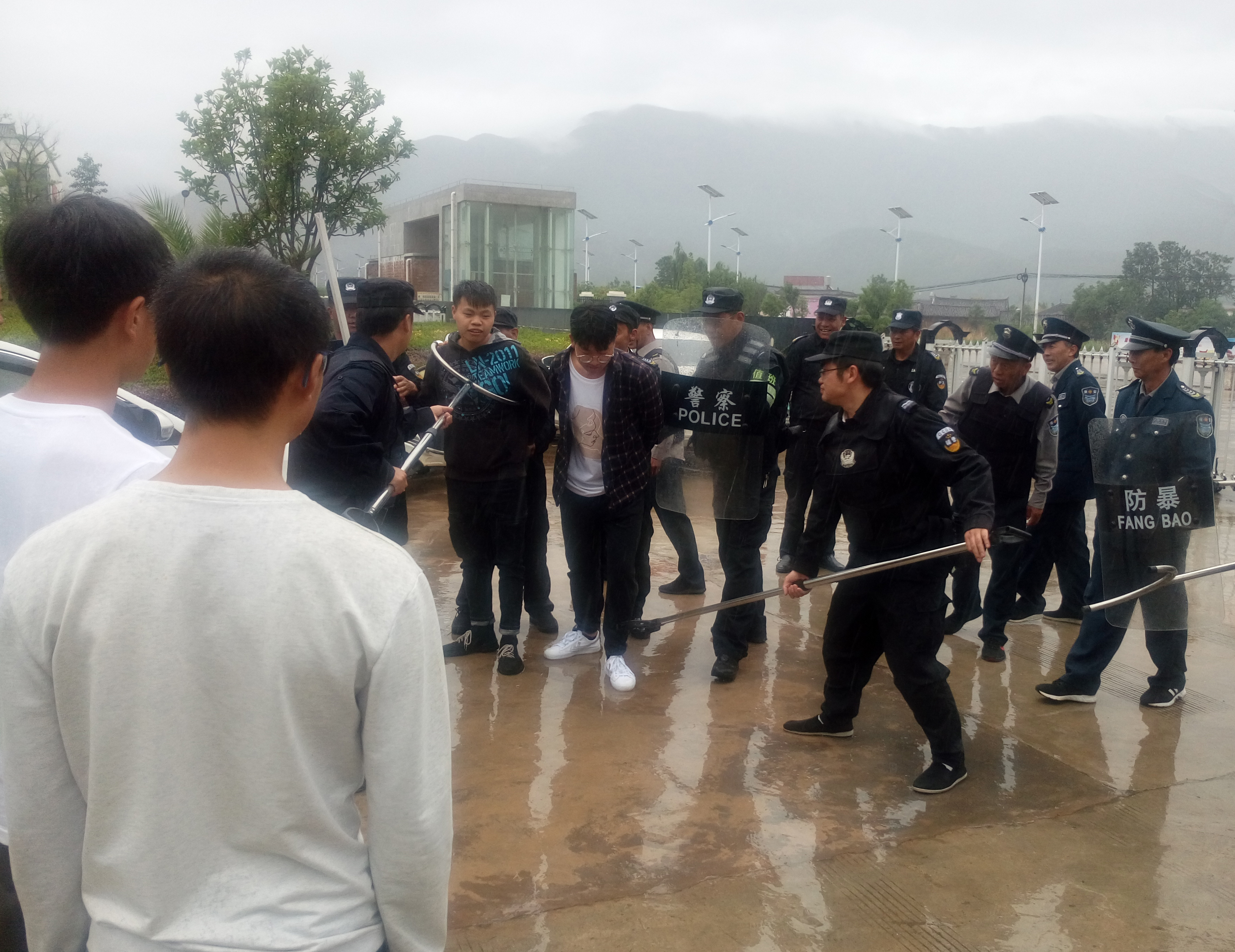 按照方案,由两名参与人员扮演“暴徒”闯入学校,通过学校安保人员及民警配合,制服“暴徒”。