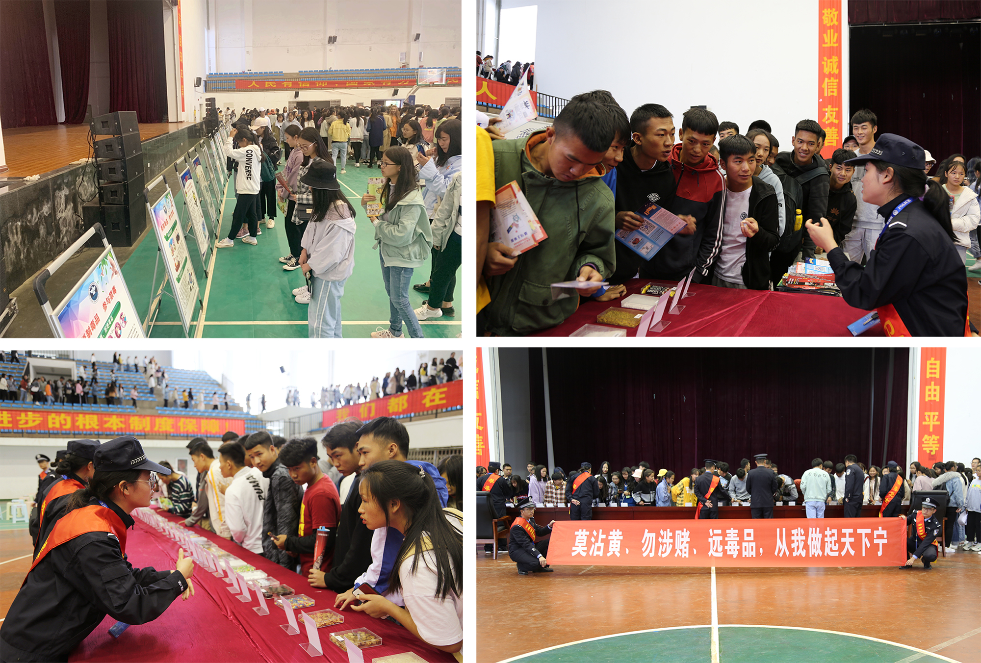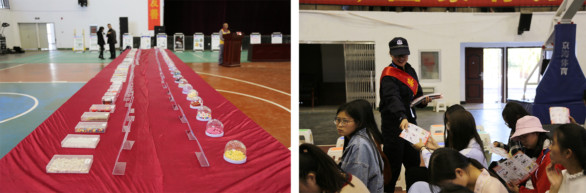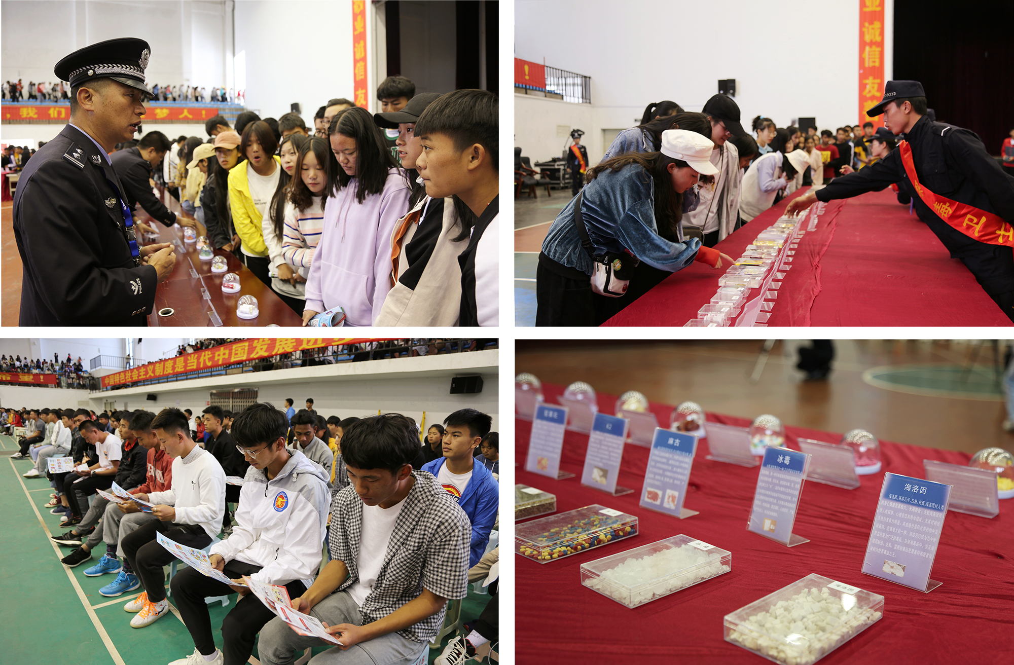 活动现场,学校邀请云南省第四强制隔离戒毒所的专业团队,通过讲座、互动、展示等多种形式开展宣传教育。云南省第四强制隔离戒毒所党委委员、副所长李登合同志作了题为“当前禁毒形势”的专题报告,教育矫治科科长杨爱军警官为现场学生进行禁毒宣传教学,两位警官围绕什么是毒品、毒品的种类及毒品的危害等方面内容进行讲解,结合多年工作的真实案例,生动形象地为全场师生进行了禁毒专项培训;详细介绍了冰毒、摇头丸、咖啡因等常见的毒品以及吸毒的危害,并重点讲述了吸食毒品对个人、家庭、社会的危害;详细分析了当前禁毒严峻形势,特别是“一朝吸毒,一生戒毒”的教训。整场报告振聋发聩,让同学们印象深刻,取到了非常好的警示作用。告诫同学们要从自身做起,珍惜生命,远离毒品,并积极投身到禁毒宣传教育中去。
