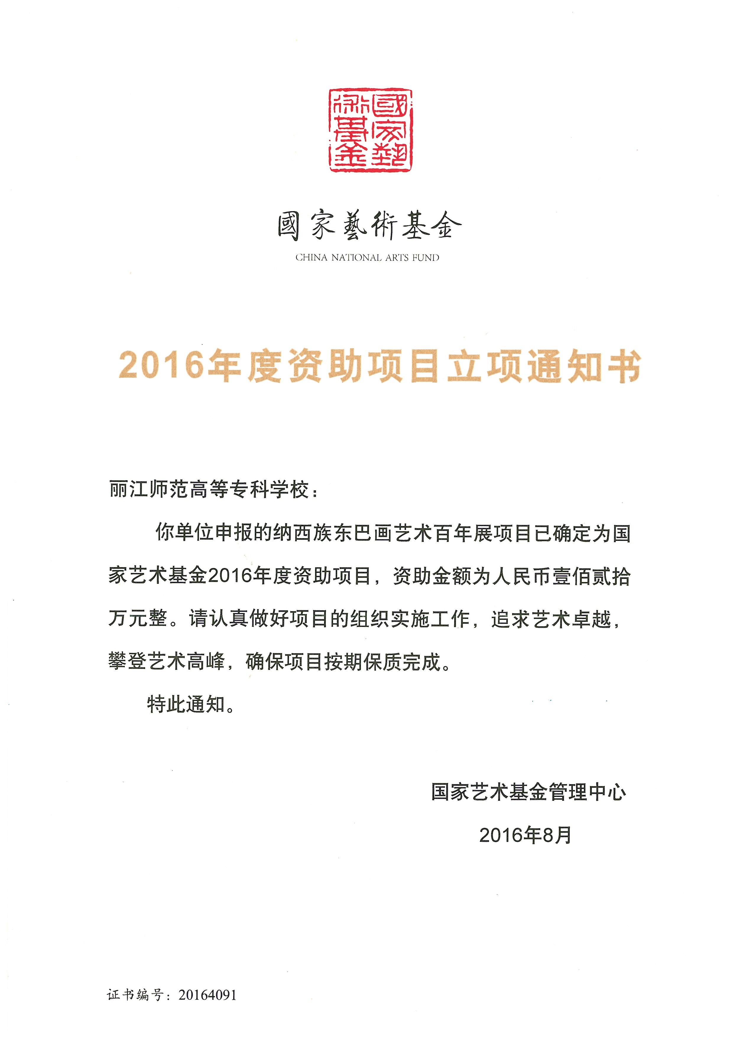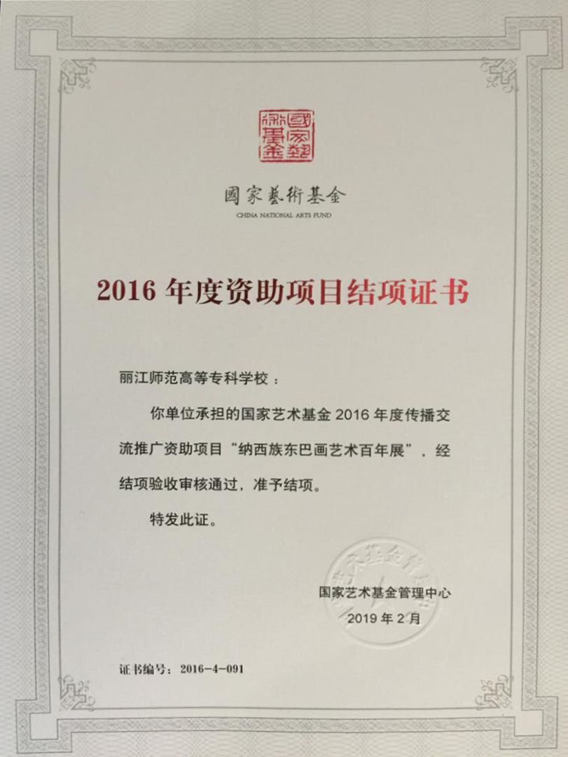 国家艺术基金项目《纳西族东巴画艺术百年展》立项资助经费120万元,实施周期3年,项目集中展示了百年以来各类东巴大师的经典作品以及现代东巴画的代表画家的代表作,是对百年东巴绘画艺术的保护、传承和集中展示,也是对纳西族东巴绘画百年成就的梳理和展示,全面展示了东巴绘画的百年成就,为新时期东巴绘画保护和传播作出了新的贡献。