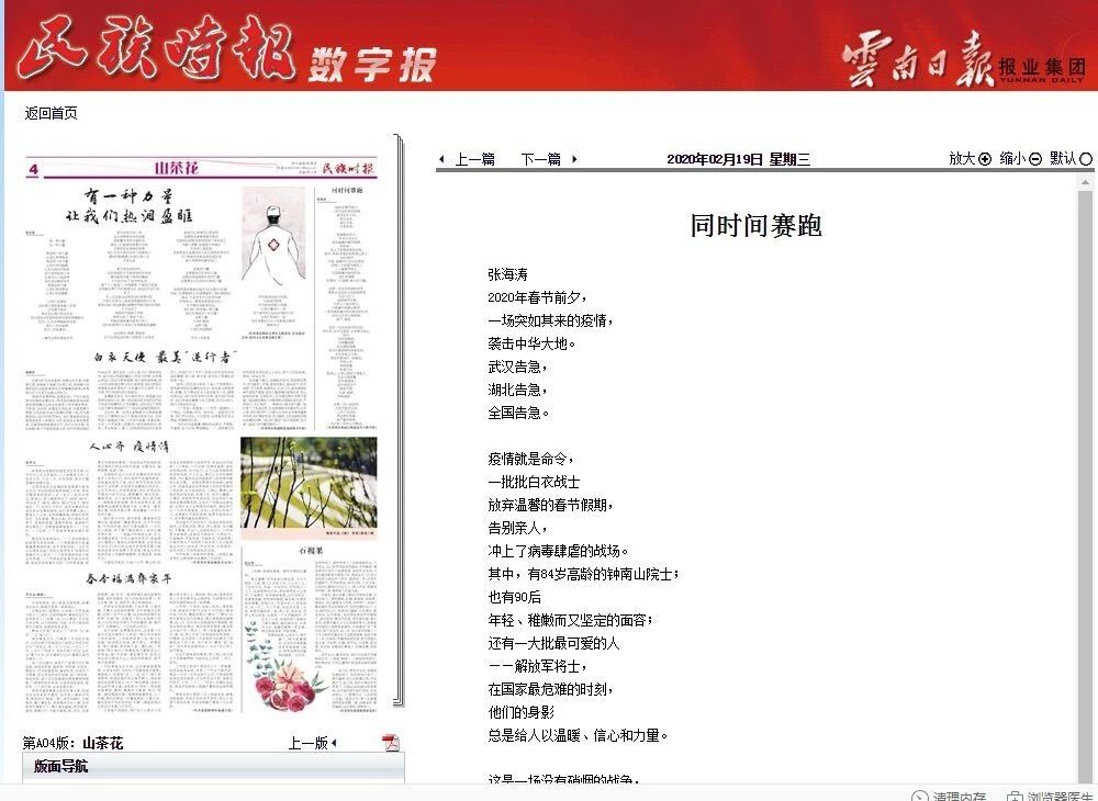 2月19日,williamhill教师教育学院张海涛副教授在《民族时报》(数字报)上发表诗歌《同时间赛跑》,讴歌奋战在抗“疫”一线的工作人员,歌颂祖国在疫情面前同时间赛跑、与病魔较量、坚决打赢疫情防控阻击战的勇气和决心。
