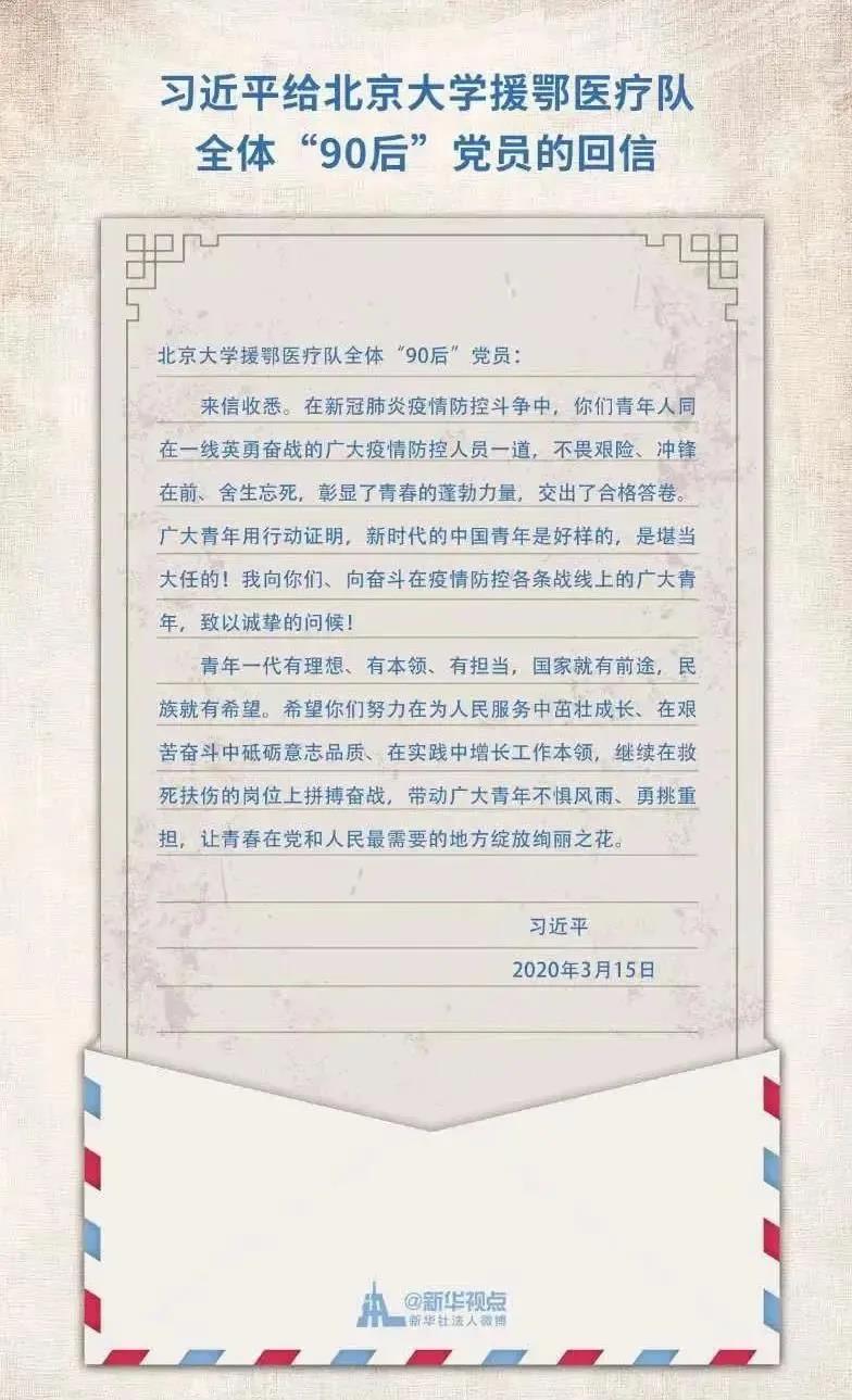 3月15日,习近平总书记给北京大学援鄂医疗队全体“90后”党员回信,向他们和奋斗在疫情防控各条战线上的广大青年致以诚挚的问候。谆谆嘱托,激励着广大青年勇挑重担,为打赢疫情防控阻击战贡献力量,让青春在党和人民最需要的地方绽放绚丽之花。