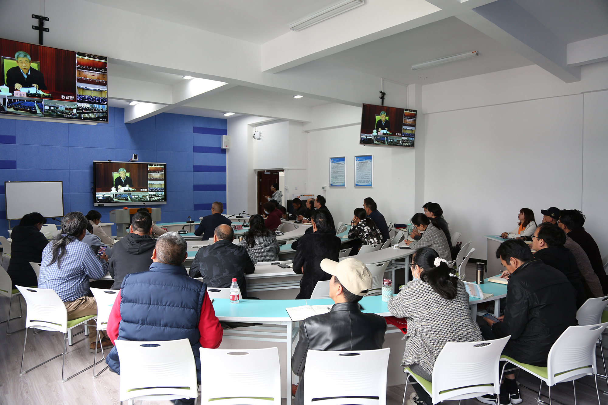 williamhill在实训楼502设分会场,党委书记张祖武、党委副书记彭鸿昌、副校长朱桂香、纪委书记李淑良、各学院党政主要负责人、各部门主要负责人在分会场收听收看了视频会议。