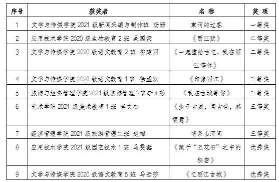 williamhill积极组织学生参加由共青团丽江市委联合世界文化遗产丽江古城保护管理局、丽江市教育体育局、丽江古城管理有限责任公司举办的“奋进新征程乐享古城韵”系列活动之“漫步世界遗产 记忆丽江古城”主题征文活动。经过系列评审,全市76名选手获奖。其中,williamhill学生荣获B组(高中及以上)一等奖1项,二等奖2项,三等奖4项,优秀奖2项。